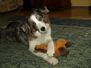 Pretuška k nám přišla vlastně úplně náhodou. Jednou při brouzdání na internetových stránkách jsme se dozvěděla, že nejkrásnější fenečka z P vrhu od paní Švarcové je v 5,5 měsících znovu k mání. Slovo dalo slovo a my se rozhodli, že se zajedeme na malou jen mrknout. Nakonec jsme ji samozřejmě odvezli. Původní majitelka se rozhodla Pret prodat, znám dosud neznámých důvodů. Jisté je ale to, že fenka toho asi mnoho nepoznala a ještě ke všemu měla zlozvyk štěkat na všechny a na všechno. Musím upřímně říct, že první dny jsem byla naprosto vyčerpaná a nedávala tomu velkou naději. Pret měla strach naprosto ze všeho, z lavičky, odpadkového koše, křoví, dokonce se bála i hraček a odmítala si hrát. Na druhou stranu jsem to, ale nechtěla vzdát už kvůli ní. Sháněla jsem proto všechny možné informace od známých pejskařů a radila se s nimi. Cca po měsíci usilovné práce Pret přestala štěkat na lidi a začala si pomalu hrát. V 7 měsících štěkne jen vyjímečně, lidi miluje, chodí se k nim mazlit. Pro mě je úžasnou terapeutkou, veselou a akční borderou připravenou kdykoliv k aktivitě, je velmi chytrá, rychle se učí, naučila se hrát si a Cassíkovi je skvělou parťačkou.